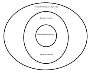 With that in mind, let’s walk through a new method for keeping up with the antagonists in our stories. It’s a method I call the three rings of conflict. Please enjoy my elementary school level drawing: