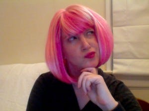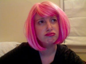 The author pouts: Why don't I look as good in pink as Laini Taylor? Okay, so now that I know how much confusion the whole Smoky Book of Blood and Bone thing has engendered, would I do things differently? I won't lie, as a debut author, it's a little nerve-wracking to have my book compared directly to work by amazing writers like Laini Taylor and Robin Wasserman. Still, who knows what might have happened if we chose another title? My UK publishers opted to call the book The Gathering Dark, a phrase lifted directly from the pages of the story. But as it turns out, Christine Johnson has a book coming out later this year titled, yes, The Gathering Dark. That Black Shore title that had me so smitten? Elizabeth Richards' new book is called Black City. Admittedly, there are no books called Otkazat'sya, but there's probably a good reason for that. Also, as I hurtle toward launch, I've come to realize that it's not worth fretting over situations well beyond my control. At least, I'm trying. Deep breaths, stiff cocktails, an agent willing to put up with my outrageous mood swings-- these all help. Plus, it's hard to get too angsty about titles when Rich Deas and Jen Wang gave Shadow and Bone a beautiful, distinctive cover that I adore and that makes me swoony every time I look at it. (I look at it a lot. I should probably acquire a fainting couch.) Noa and I recently sat down to pitch new titles for Books 2 and 3 of the Grisha Trilogy. Hopefully, we'll end up with something unique that won't turn up all over the shelves next year. I'm inclined to take preventative measures. How do you guys feel about Shadow and Fat Man Eating an Eclair? (Many thanks to Carrie Lawler Arcos for the loan of her pink wig!)
