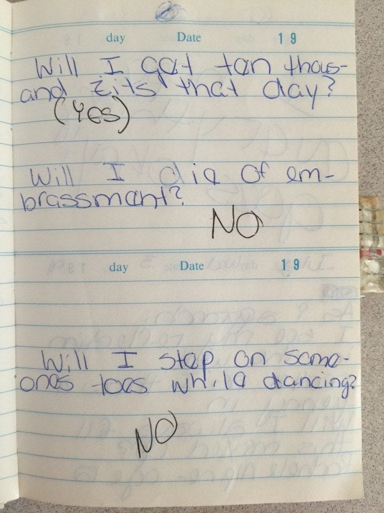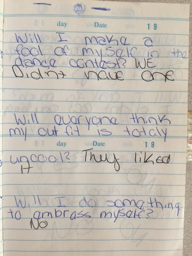 In the book, Grace goes to her first boy/girl party, and I pretty much struck oil with all the information I provided for myself in my diary when my own experience going to my first boy/girl party. I had created a list of questions/worries before I went to the party and afterwards, I filled it all out. Talk about the perfect glimpse into the head of a middle schooler!