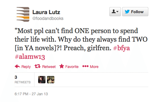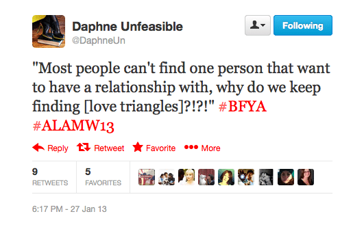 I've been thinking about love triangles ever since YALSA's BFYA Teen Feedback Session at ALA Midwinter. More specifically, ever since these two tweets, paraphrasing what one of the teens said during the panel, showed up in my feed: