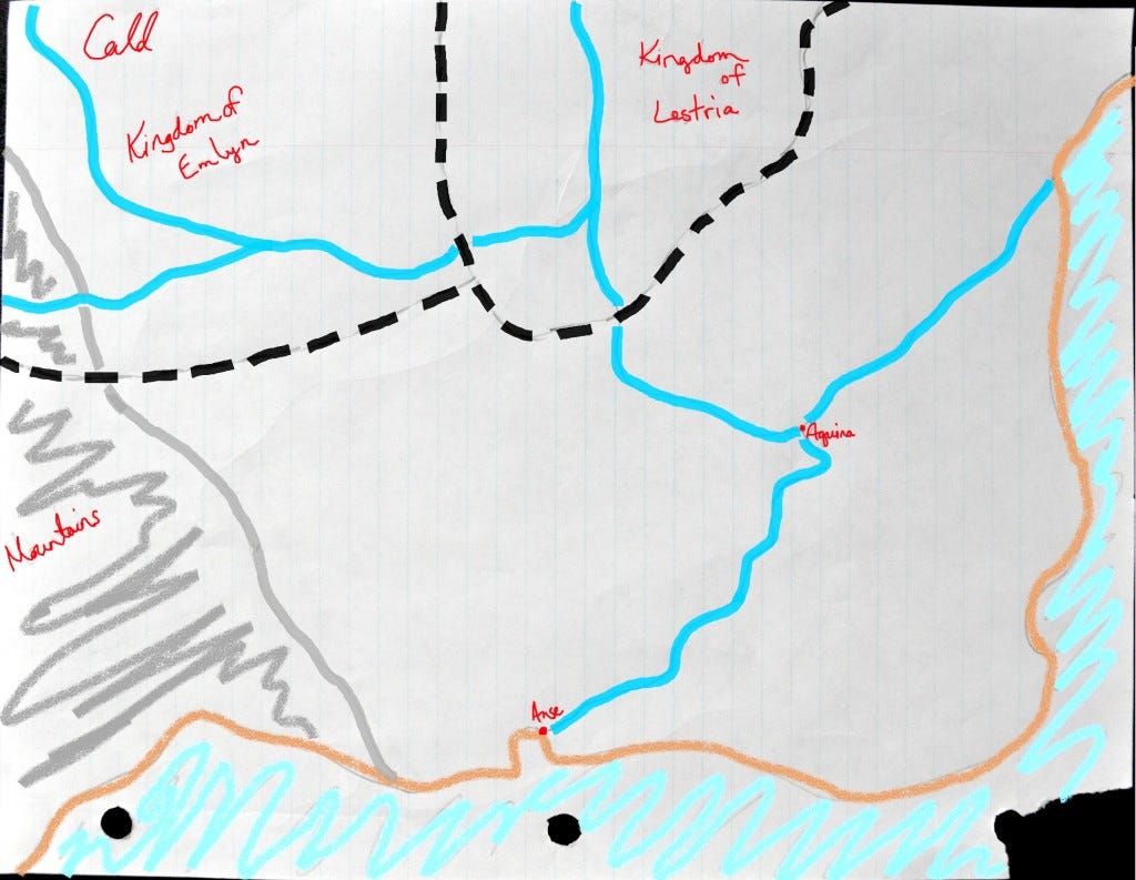 I outlined the kingdoms, put in little dots where I wanted cities and towns to be, and slowly started filling in the names. I already had Aquina, Cald, and Emlyn, so now I needed the rest. Lestria from the first map turned into Letria, I kept the port city of Anse, I gave the mountain range the rather generic name of Dark Mountains, and titled my rivers however I wanted.